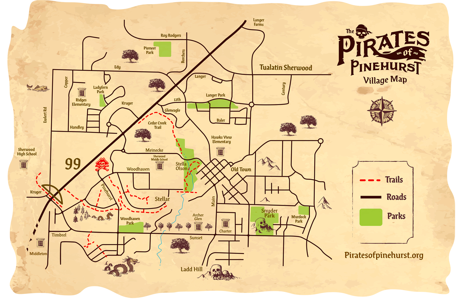 The Pirates of Pinehurst’s gold has been hidden on the trails and parks of Sherwood, Oregon. If ye’ be a brave pirate, then grab a map, go hunting and become a legend!